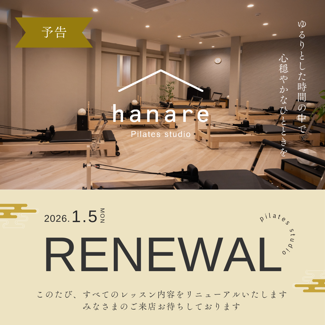 このたびPilates studio hanare京都二条店では、みなさまにとって より心穏やかなひとときを過ごしていただけるよう レッスン内容を一部リニューアルいたします✨